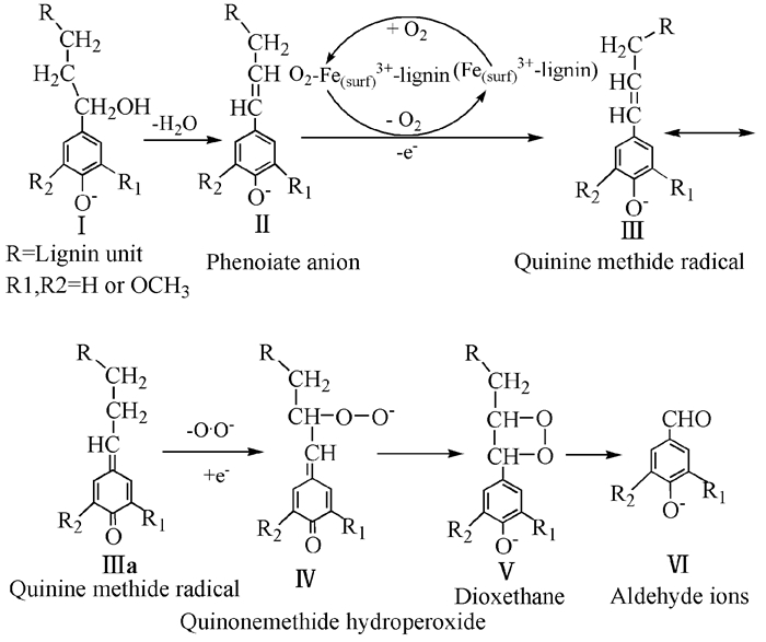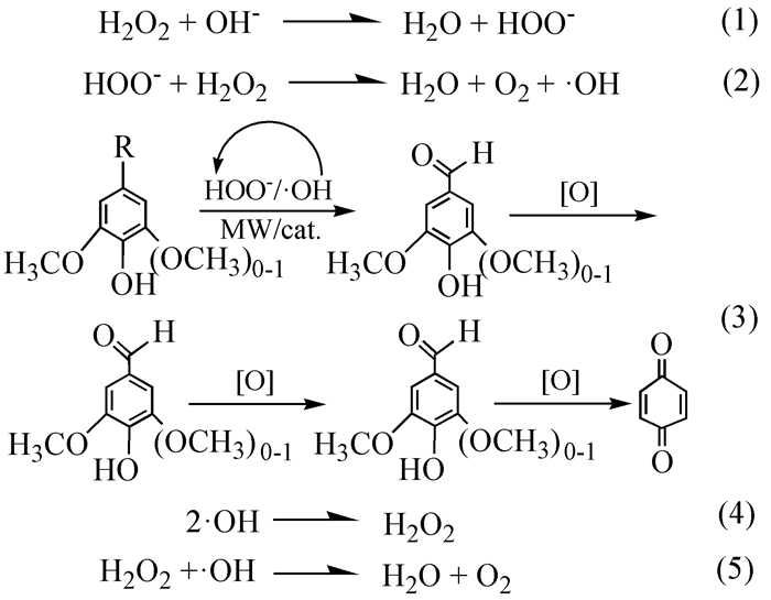无金属催化氧化降解木质素的反应机理主要在于催化剂自身的氧化活性,如本身具有强氧化性的硝基苯或H2O2在一定的条件下,利用自身的氧化活性对木质素进行氧化降解。
