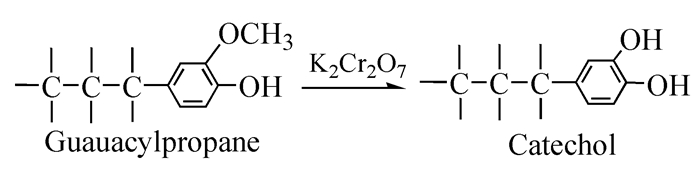 重铬酸钾在乙酸的存在下可被用于木质素和硫代木质素的脱甲基反应。在乙酸中,重铬酸钾可以氧化木质素,使之具有儿茶酚结构(图式9),甲氧基含量可以从11.9%降到2.8%,酚羟基含量由原来的2.4%提高到11.2%[65]。
