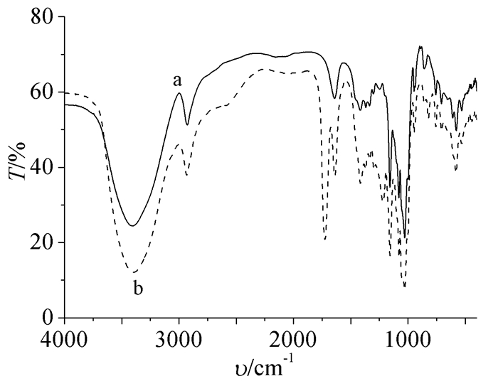 为了确定是否对β-CD改性成功,采用红外光谱进行分析,其结果如图 1。曲线(a)中3400cm-1处为-OH的伸缩振动吸收峰;2927cm-1处为-CH2的反对称伸缩振动吸收峰;1640、1416 cm-1处为C-H面外变形振动和-CH2变形振动;1028cm-1处为C-O-C的伸缩振动和β-CD内腔C-O伸缩振动的吸收峰。曲线(b)与(a)相比,保持了β-CD的特征吸收,又出现了1638cm-1的C=C键的伸缩振动吸收峰及1725cm-1的C=O伸缩振动吸收峰,表明存在C=C键及羰基,从而可以初步确定衍生物为MAH-β-CD。