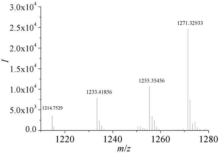 为进一步验证合成产物为MAH-β-CD,采用ESI -TOF/MS,正离子全扫描方式对合成产物进行质谱分析,其结果如图 2。图中m/z 1233.41856的离子峰对应MAH-β-CD的[M+H]+峰,当其失去质量数为18(H2O)的碎片后产生m/z 1214.7529的碎片峰;m/z 1255.35456与m/z 1271.32933分别为[M+Na]+峰与[M+K]+峰。从而可以确定合成的环糊精衍生物为MAH-β-CD。