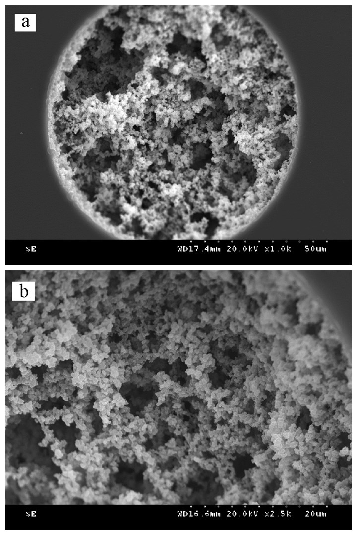 为了更好观察整体柱固定相结构,通过扫描电镜对优化条件下制备的电色谱整体柱内部结构进行表征。从图 3可以看出,聚合物成功键合到毛细管内壁上,并且在柱内形成了致密的网状结构,其形态错综复杂,由此可以推测该柱有较强的机械强度,能承受较大的压力,且整体柱内孔隙均匀,有较大的孔径,说明该柱具有良好的通透性。