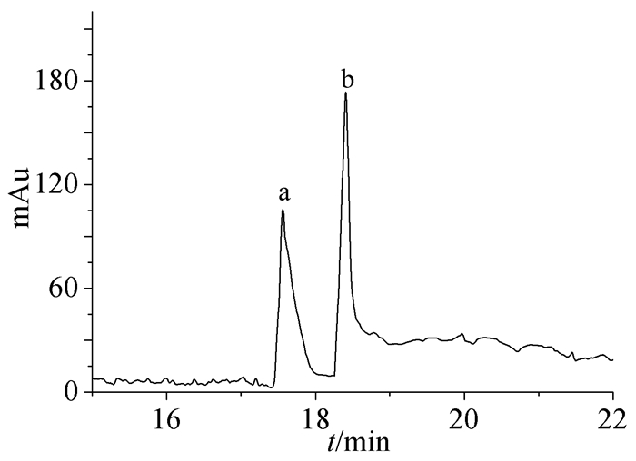 以DL-精氨酸为手性分离物,在25kV的工作电压下用20mmol/L NH4Ac (pH=8.50)作为缓冲溶液进行连续5次分离。其结果见表 2,精氨酸的单一对映体保留时间(ta,tb)的RSD分别为0.77%、1.05%。整体柱有良好的分离能力,分离度均达到2.5以上。该柱可连续使用14h,间歇性使用2个月以上仍具有良好的手性分离性能,可见该柱具有良好的稳定性。
