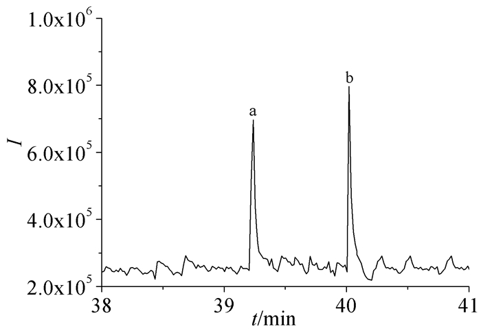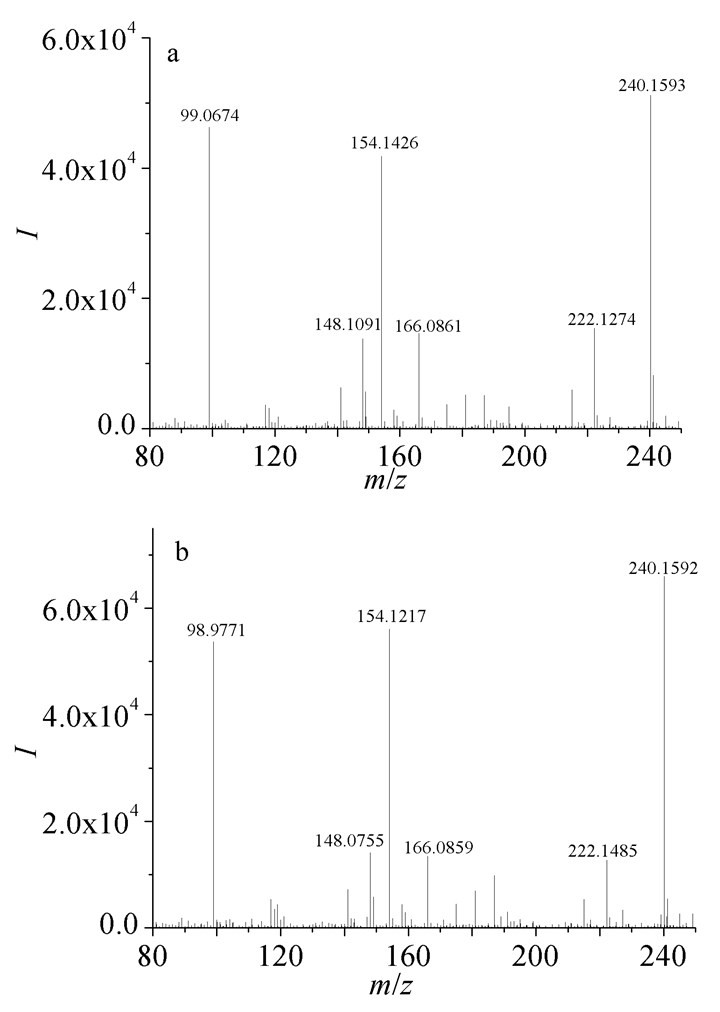 图 5为SAL对映体的质谱总离子流图(TIC),TIC中每个组分的提取质谱图见图 6。图 6(a)为保留时间39.237min对映体(a)的提取质谱图,其中m/z 240.1593的离子峰对应SAL的[M+H]+峰,当其失去质量数为18(H2O)和74([NH3+C (CH3)3])的碎片后分别产生m/z 222.1274和166.0861的质谱峰、同时失去两碎片时产生m/z 148.1091的质谱峰,当[M+H]+失去质量数为86([CH2NHC (CH3)3])的碎片后产生了m/z 154.1426的质谱峰,质量数为99的质谱峰为[CH2CH2NHC (CH3)3]碎片。图 6(b)为保留时间40.012min对映体(b)的提取质谱图,同理,m/z 240.1592的离子峰对应SAL的[M+H]+峰,m/z 222.1485、166.0859、154.1217、148.0755、98.9771分别对应SAL的相应碎片峰,因此可以判断图 5中的(a),(b)为SAL的对映体峰。