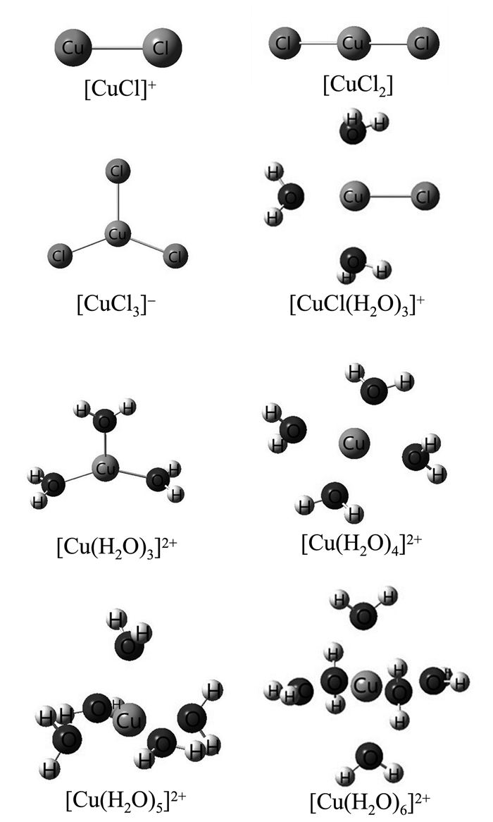 DFT是一种较为精确的量子化学计算方法,在预测材料性能、合成反应、吸附和溶剂化现象等方面具有广泛的应用[12~15]。本文在计算过程中只考虑溶液中第一溶剂化层的性质,采用DFT/B3LYP方法优化溶液中可能存在的团簇构型以及它们的过渡态,选用“6-31G (d, p)+LanL2TZ”混合基组,基组的设定使用关键词GENECP,其中Cl、H、O元素选取6-31G (d, p)基组,对Cu2+采用LanL2TZ赝势基组,以减少对金属优化的计算量。对过渡态构型进行频率计算,确认所得结构是否为势能面上的极小值或一阶鞍点,计算过程中考虑溶剂效应,并通过内禀反应坐标(IRC)计算进一步验证了过渡态的连接性。