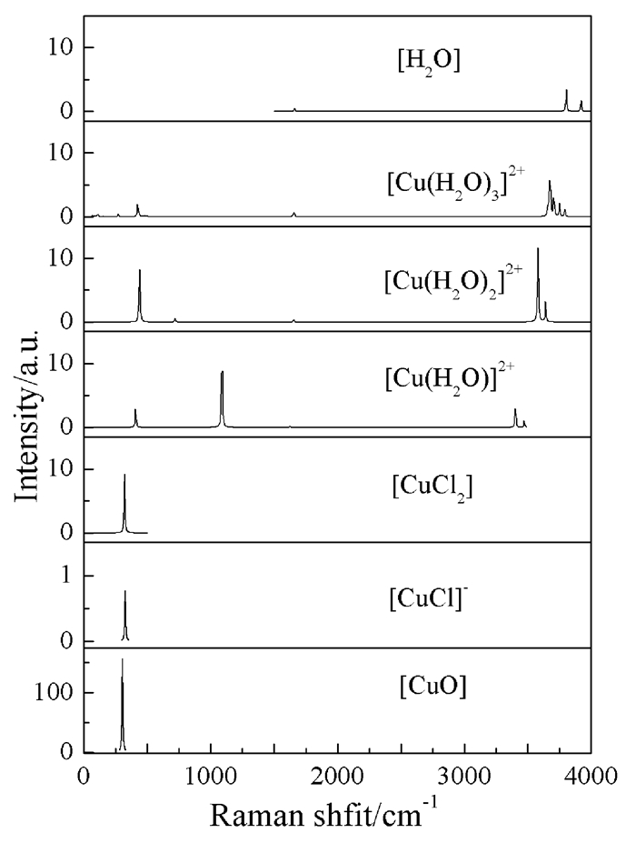 为研究溶液中团簇的存在形式,在上述分析的基础上,对优化好的低能结构执行Freq=Raman命令进行拉曼光谱计算,得出理论拉曼峰的振动方式,图 3为CuO、部分低能团簇以及H2O的理论拉曼光谱。结果表明在100~500 cm-1之间主要为Cu-Cl、Cu-O两种振动方式,考虑到[CuClm]2-m可以再和水结合成[CuCl (H2O)]+、[CuCl (H2O)2]+、[CuCl (H2O)3]+等结构,因此在100~500 cm-1之间主要为Cu-O的振动方式,在3400~4000 cm-1范围内为O-H的对称和不对称伸缩振动。