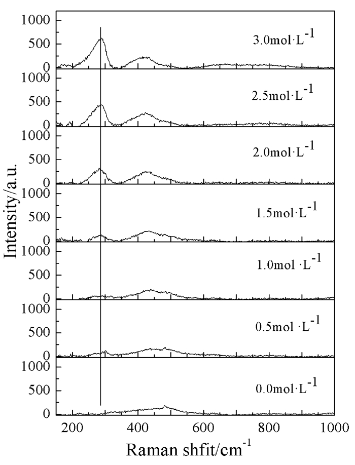 理论拉曼光谱在100~500 cm-1主要为Cu-O的伸缩振动峰,在3400~4000 cm-1范围内为O-H伸缩振动峰,实验光谱在200~340 cm-1出现明显新峰,在误差允许范围内,理论计算与实验光谱一致。拉曼光谱实验得出溶液浓度可以改变拉曼峰的强度,对拉曼光谱进行高分峰发现,随着溶液浓度增加,溶剂化数目减小。