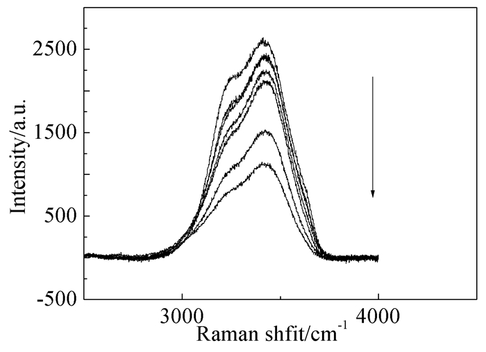 图 5中2500~4000 cm-1拉曼光谱峰主要为O-H伸缩振动引起的。随着溶液浓度的增加,峰的强度逐渐减小,峰形有明显变化。说明溶液浓度不同,CuCl2对水的结构影响不同,溶剂化产生的团簇结构及含量不同,导致溶液极化率发生改变。