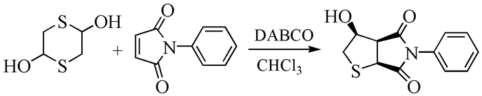 在10mL锥形瓶中加入0.15mmol 2, 5-二羟基-1, 4-二噻烷、0.1mmol N-苯基马来酰亚胺、10mg酶和3mL水,在40℃的恒温振荡培养箱(200r/min)中反应(TLC跟踪)。反应完成后过滤,旋蒸除去溶剂,经薄层色谱(硅胶板,二氯甲烷/乙酸乙酯=4:1)分离得到产物,并用1H NMR和13C NMR进行结构表征。