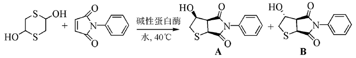 首先,考虑到酶的水溶性及温度对酶活性的影响,我们以2, 5-二羟基-1, 4-二噻烷和N-苯基马来酰亚胺为原料,以去离子水为反应介质和40℃条件下考察了11种酶的催化效果。由表 1可知,碱性蛋白酶和木瓜蛋白酶催化效果较好,反应产率可达90%以上(表 1,试验1,2);而无酶对照实验的产率仅有35%(表 1,试验12);其他试验用酶也表现出不同程度的促进效果(表 1,试验3~11),但碱性蛋白酶的催化效果最好。
