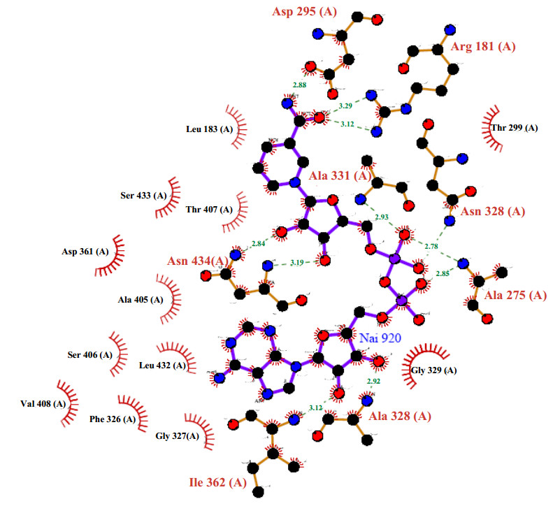 蛋白质与小分子的晶体结构为研究吡啶核苷酸辅酶及其依赖型脱氢酶相互作用提供了依据, 目前在蛋白质晶体结构数据库(Protein Data Bank, PDB)中能够搜索出2123种NAD+依赖型酶晶体结构, 并且数量在不断增加.根据酶晶体结构可以了解酶与NAD+相互作用的氨基酸残基, 进而阐明酶与辅酶相互作用规律[20].如在人线粒体中与NAD+中的AMP结合的具体氨基酸残基是K346、A312、G313、N259和E314[21], 猪蛔虫(1LLQ)中与NAD+中的AMP结合的具体氨基酸残基是L432、G327、I362、A328、G329、A330和N275[22](图 11).