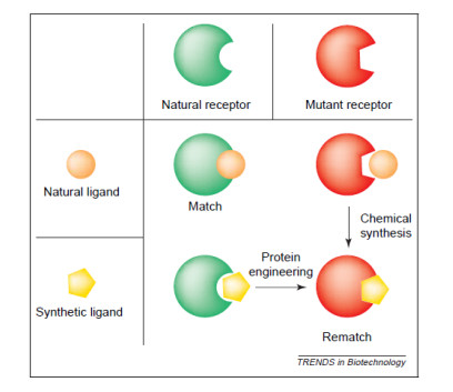在生物体系中选择性或专一性研究或调控靶分子的功能非常困难, 常常会对其它生物大分子产生扰动, 必须合成新的高度特异性的蛋白质-配体对, 才能选择性地调节基因表达或细胞过程.生物正交体系的兴起为解决这一问题提供了可能[28].生物正交体系是一种将有机化学和分子生物学结合起来的化学生物学研究手段.它通过有机合成获得小分子化合物, 通过分子生物学段改造靶分子的高级结构, 在理想条件下, 合成小分子配体不能与未经改造的靶分子有效结合, 而与改造的靶分子很好的结合, 并表现出正常的活性; 而天然的小分子也不能与改造的靶分子有效结合(图 12)[29].这种新的高度特异性的蛋白质-配体对能够选择性地调控基因表达或细胞过程, 已引起了国内外广泛关注[30].