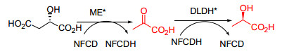 针对小分子配体与蛋白质相互作用的研究, 正交体系所需要的三个要素是:合成可供筛选的小分子配体文库, 构建突变型蛋白质的表达文库, 小分子配体与蛋白质相互作用的高通量筛选.我们课题组[31]前期合成了大量NAD+类似物.这些类似物保留了催化反应活性中心NMN部分, 改变了与酶结合的AMP部分, 包括简单脂肪烃、芳香烃、胞嘧啶及其衍生物、三唑环取代AMP的NAD+类似物.同时成功地构建了苹果酸酶突变库.通过与对辅酶结合域突变的苹果酸酶文库高通量筛选, 获得两种生物正交催化体系.一种是5-氟胞嘧啶二核苷酸(NFCD)与突变的苹果酸酶高通量筛选, 得到突变苹果酸酶ME-L310R/Q401C.这种突变酶对NFCD具有较高的催化活性, 而对NAD+具有很低的催化活性; 同时天然的苹果酸酶对NFCD具有很低的催化活性, 因此建立了一种新型的生物正交突变酶-辅酶配体, 可以用来选择性研究苹果酸酶.通过基因序列分析, 对D-乳酸脱氢酶(DLDH)和苹果酸脱氢酶(MDH)定点突变获得突变体DLDH-V152R和MDH-L6R, 能有效利用NFCD的还原态NFCDH, 实现了NFCD的循环再生, 使NFCD在催化转化L-苹果酸时只需要催化量[14a](图 13).同时, 也考察了胞嘧啶环上不同取代基对辅酶与野生型酶和突变酶相互作用关系[14b].胞嘧啶二核苷酸和5-溴胞嘧啶二核苷酸与突变苹果酸酶(ME L310R/Q401C)反应活性与野生型苹果酸酶与NAD+反应活性相当, 证明了NAD+类似物与突变酶功能配对可以代替野生型酶与NAD+配对行使其生化功能.同时取代基体积增大, 对突变酶和野生型酶选择性增强.当取代基为甲基时几乎不能够被野生型苹果酸酶识别, 而对突变酶ME L310R/Q401C具有较高的催化活性, 从而得到新型生物正交催化体系(图 14).