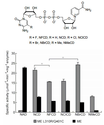 NAD+类似物与突变苹果酸酶生物正交体系的成功构建, 可以为其它NAD+依赖型酶(如乳酸脱氢酶、乙醇脱氢酶、谷氨酸脱氢酶等)正交体系的建立提供理论依据和技术支持.这两种生物正交催化体系的建立证明了NAD+类似物可以与NAD+依赖型酶突变库中的酶形成特异性配对, 这种高度特异性的NAD+类似物-NAD+依赖型酶突变体配对即NAD+依赖型生物正交氧化还原体系将有助于人们选择性和专一性研究一种NAD+依赖型酶, 研究其参与细胞活动的机理, 为研究细胞内的代谢过程及调控过程提供科学依据.