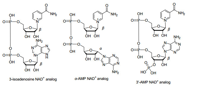 NAD(H)分子中腺嘌呤环含有多个N, 可以与核糖环形成糖苷键. Leonard教授合成了含3-isoadenosine的NAD+类似物, 其与不同脱氢酶相互作用活性与NAD+活性为6%~140%, NAD(H)分子中五元核糖均为β构型.为了考察核糖构型对酶活性的影响, Leonard等[6]合成了含α-AMP的NAD+类似物, 在不同的脱氢酶作用下, 可作为氢受体.为了考察磷酸对NAD(H)活性的影响, 合成了含3'-AMP的NAD+类似物, 其与脱氢酶作用完全没有活性(图 2).由此说明NAD(H)构型及NADP(H)中磷酸位置异构都会影响其与NAD(H)及NADP(H)依赖型酶相互作用.