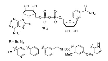 Windmüller和Kaplan[7]首先在富电子的腺嘌呤的N-1和N-6的位置进行烷基化并引入其他官能团, 得到了一系列的类似物.其中, 在N-1上引入其它基团, 辅酶活性大大降低, 而在N-6上引入其它官能团的NAD+类似物与NAD+依赖型脱氢酶的活性与NAD+与脱氢酶的活性相当. Koberstein[8]向嘌呤环的8位引入溴、叠氮基团, 实现了腺嘌呤环8位不同取代基NAD+类似物的合成, 此类化合物具有一定的酶活, 但是具有较高的km值, 说明与NAD+依赖型的脱氢酶相互作用减弱. Wagner等[9]在NAD+分子腺嘌呤环8位上修饰合成了NAD+荧光探针用于检测NAD+消耗型酶, 修饰之后的NAD+类似物仍然能够被NAD+依赖型酶识别, 说明两者之间存在相互作用(图 3).张礼和课题组[10]改变NAD+分子中腺嘌呤环2位和6位合成NAD+类似物, 发现这些类似物为腺苷二磷酸核糖环化酶CD38抑制剂, 利于解析NAD+类似物结构与活性相互关系(图 4). Lin等[11]在NAD+分子腺嘌呤环6位和8位上引入炔基合成新的NAD+类似物, 用来标记聚腺苷二磷酸核糖转移酶, 说明在腺嘌呤环的6位和8位进行修饰对NAD+与聚腺苷二磷酸核糖转移酶相互作用影响较小(图 5).