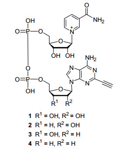X-ray晶体结构表明, 呋喃糖环的2, 3位羟基会与脱氢酶的氨基酸残基相作用, 用脂肪链取代会导致类似物与酶作用的减弱, 这主要是由于类似物与酶形成复合物的过程受到了很大的空间位阻[15]. Marx等[16]合成4种改变腺苷核糖中羟基NAD+类似物, 并在腺嘌呤环2位上引入炔基以标记腺苷二磷酸核糖转移酶, 这4种NAD+类似物阐明了腺苷二磷酸核糖转移酶与NAD+相互作用关系, 证明了2位羟基在蛋白修饰中的重要性及腺苷二磷酸核糖转移酶的底物相容性(图 9).